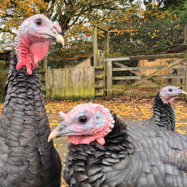Rescued Bronze Turkeys, named for the dinner they escaped! They are very large, Very noisy and utterly harmless. They will run towards you simply because they get excited to see guests and have an in-built fear of missing out!